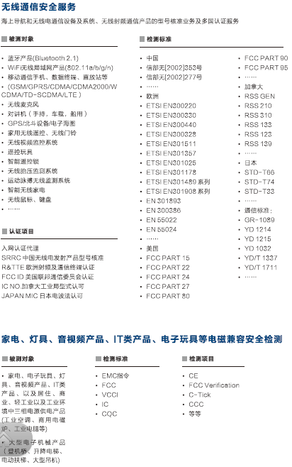 和辐射干扰发射量之测试及各种讯号传输时,干扰传递特性之测试。
